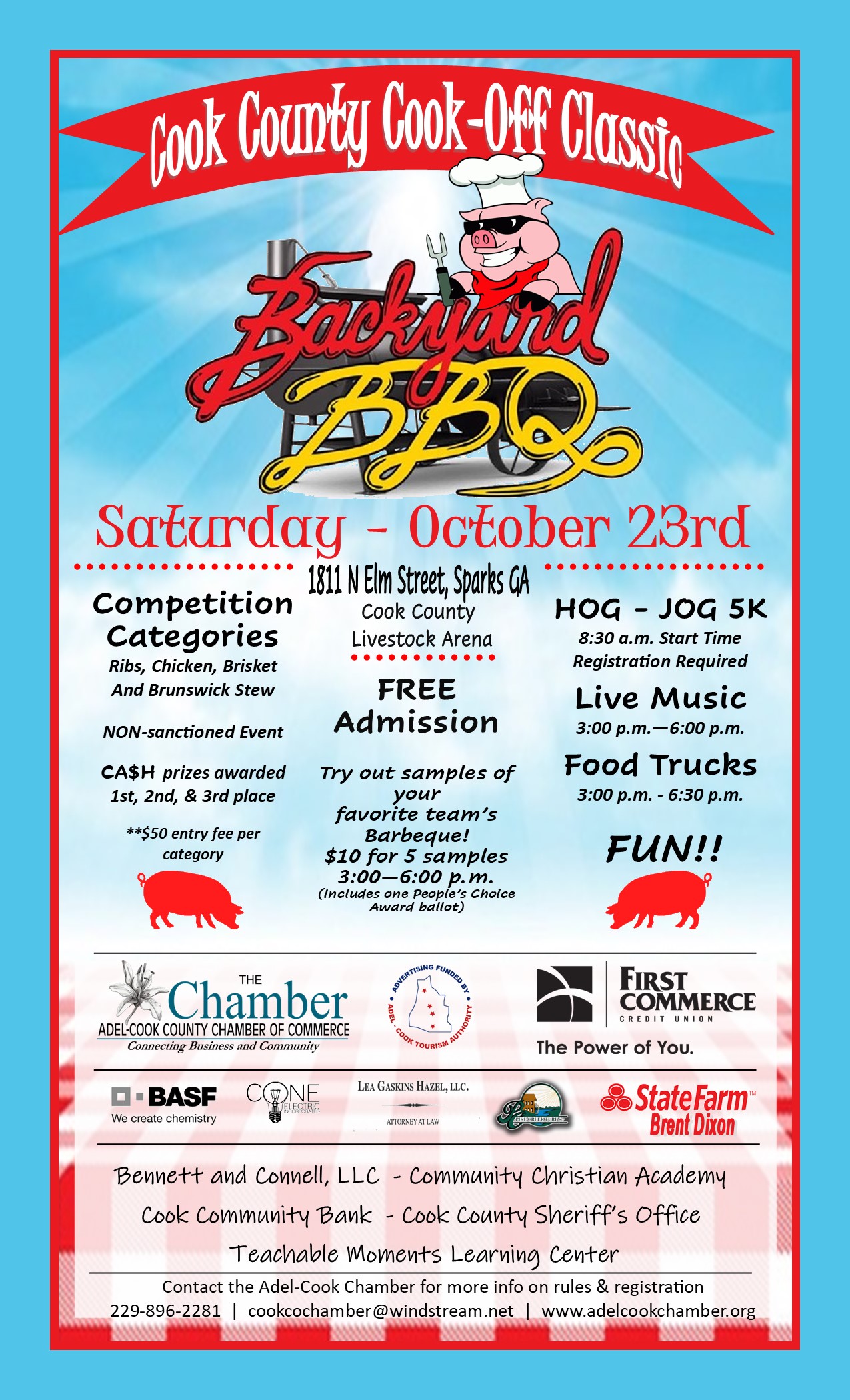 20 Sep, 2021 Chamber announces 2021 Fall lineup 2nd Annual Cook County Cook Off Classic Backyard BBQ Competition and Hog Jog 5K set for October 23rd.